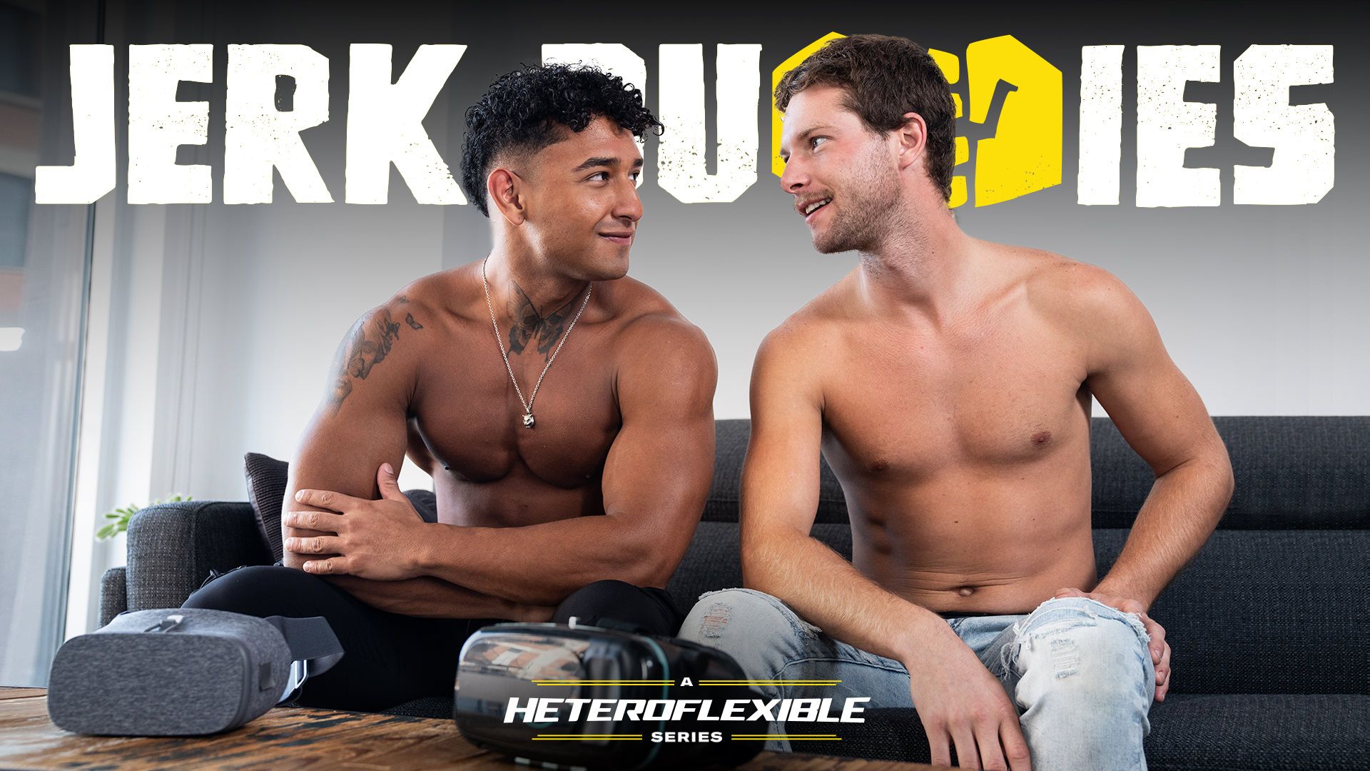 As they quickly discuss the situation, they convince themselves that it would be fine if they jerked off side-by-side. Plus, it's not like it would be gay or anything since they'll be looking at two female pornstars anyways through the goggles. This would just be two straight dudes having a little fun next to each other. Nothing more, nothing less. But after a few minutes of masturbation, these dudes start to wonder if they might need a little extra help to turn the virtual... into a sexy reality.